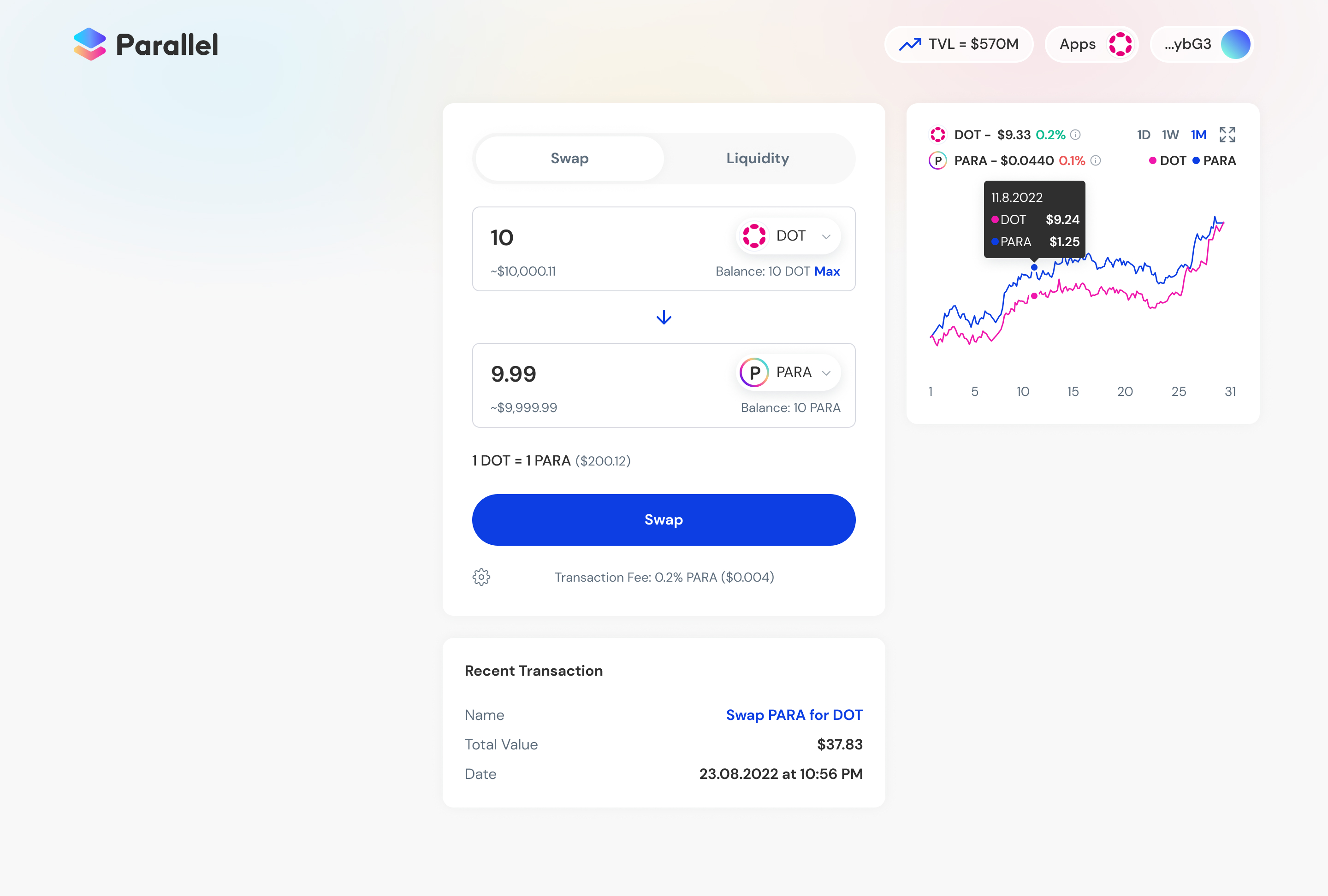 Enables users to swap any assets on the Polkadot ecosystem. Our UI integrates useful analytics for users to make trading decisions.