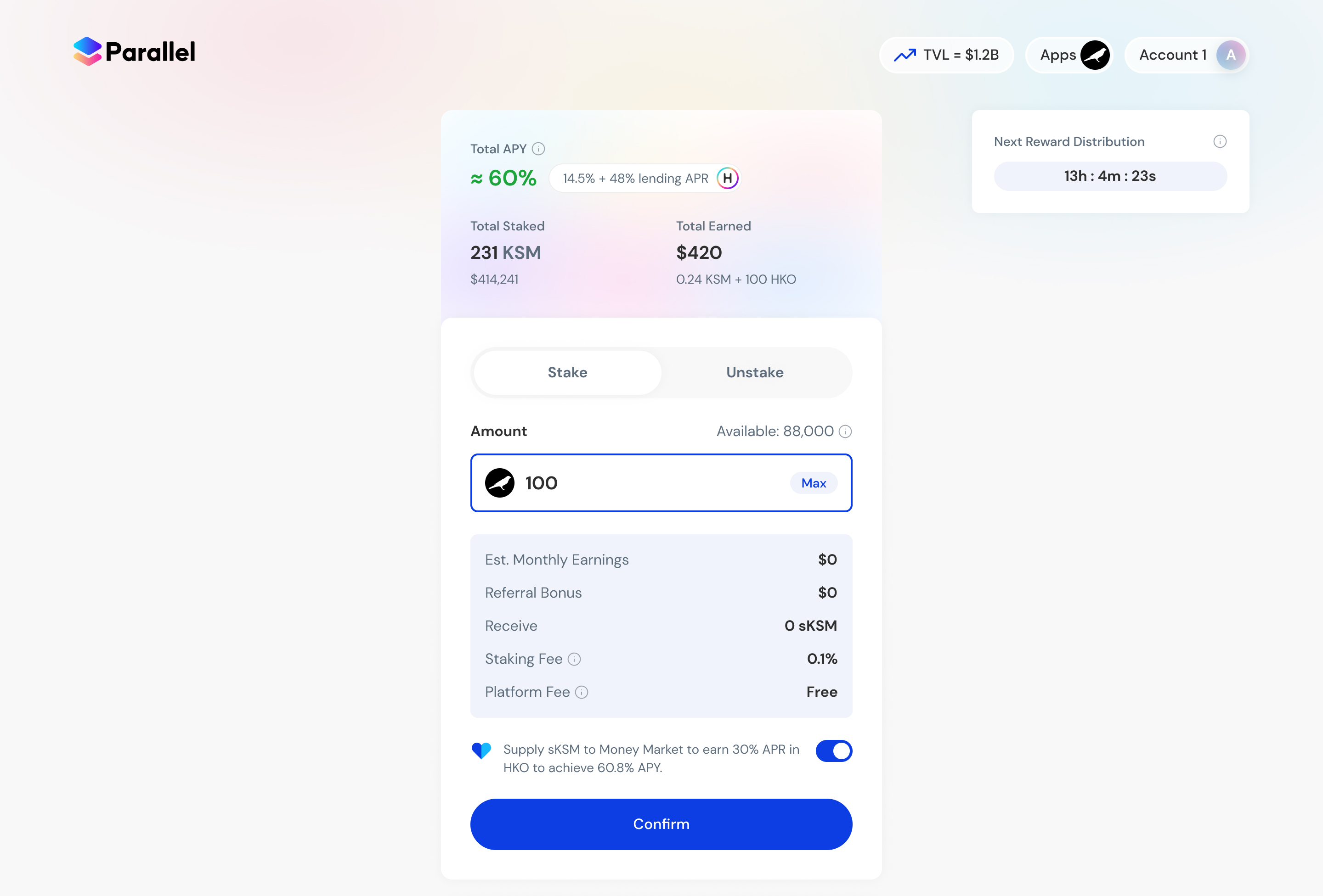 The most convenient option for users to stake their KSM or DOT. Leveraging our ecosystem, we enable users to easily earn incentive native tokens and supply their staked derivative tokens to Money Market for extra yield.
